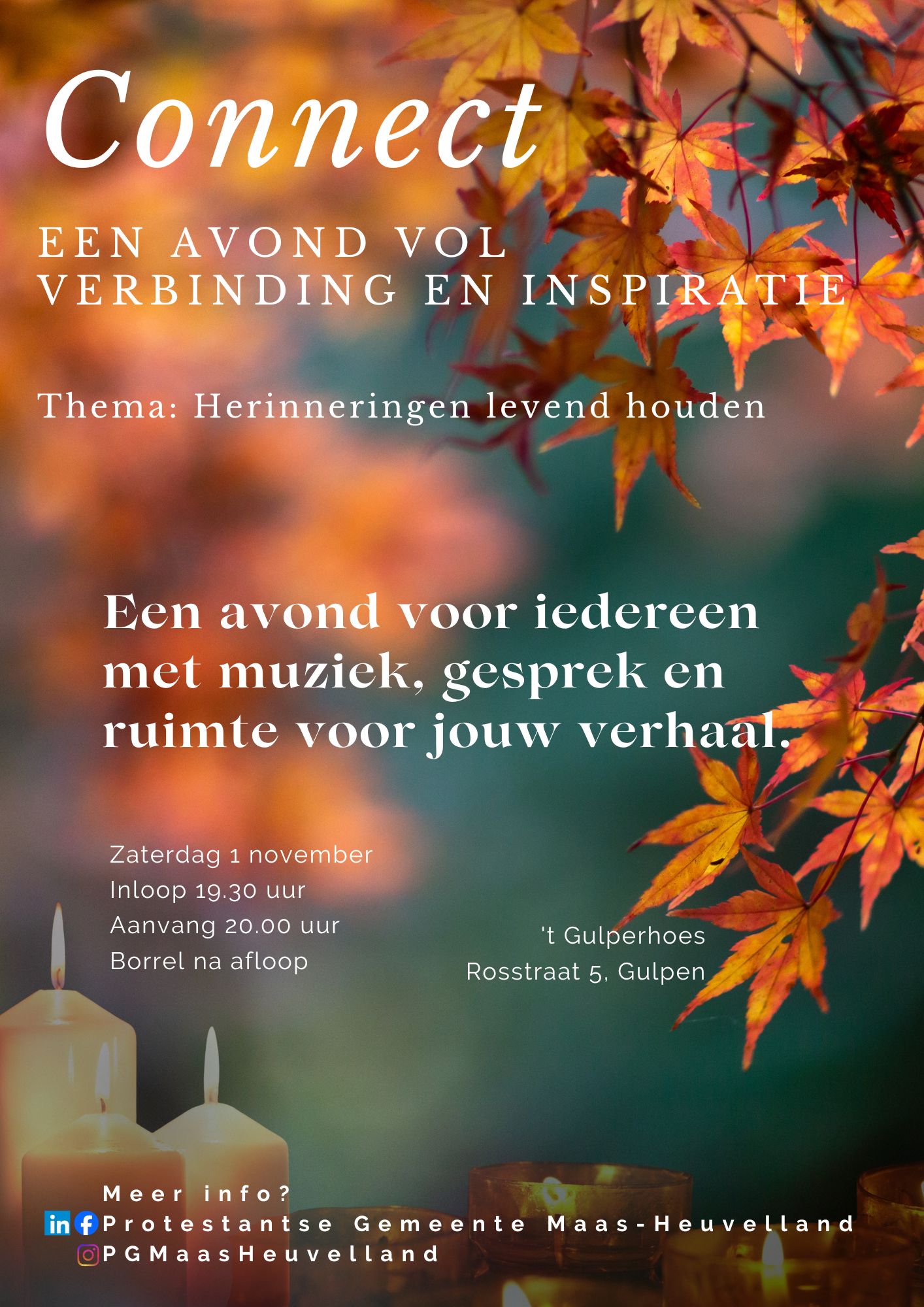 Herinneringen maken ons tot wie we zijn. Op deze Connect-avond duiken we samen in het thema: ‘Herinneringen levend houden’. We delen verhalen, luisteren naar elkaar en ontdekken hoe herinneringen ons verbinden, over generaties heen.