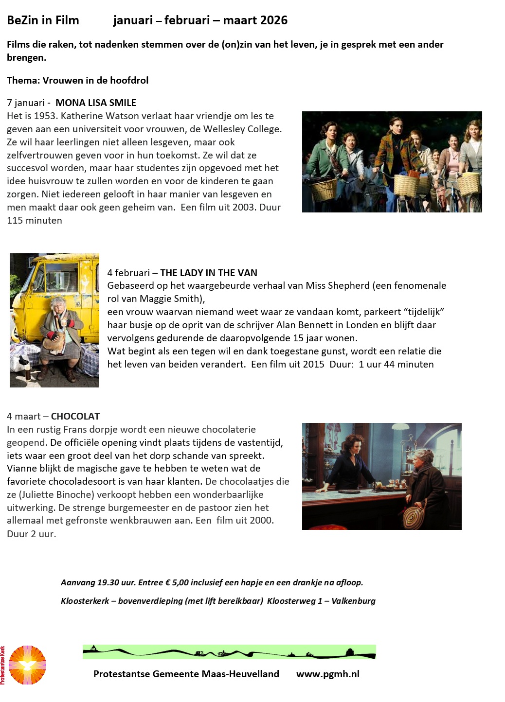 Plaats: Kloosterkerk Valkenburg Datum: Elke 1e woensdag van de maand Tijd: 19.30 uur Kosten: € 5.- inclusief consumptie Nagesprek Samen naar een mooie film kijken die van alles aan vragen oproept. Wat is het dan fijn om na afloop daar met elkaar over te kunnen praten, gedachten uitwisselen en standpunten uitwisselen onder het genot van iets te drinken en te eten. Informatie: Dingena Spreeuwenberg werkgroep (Be)zin in film |