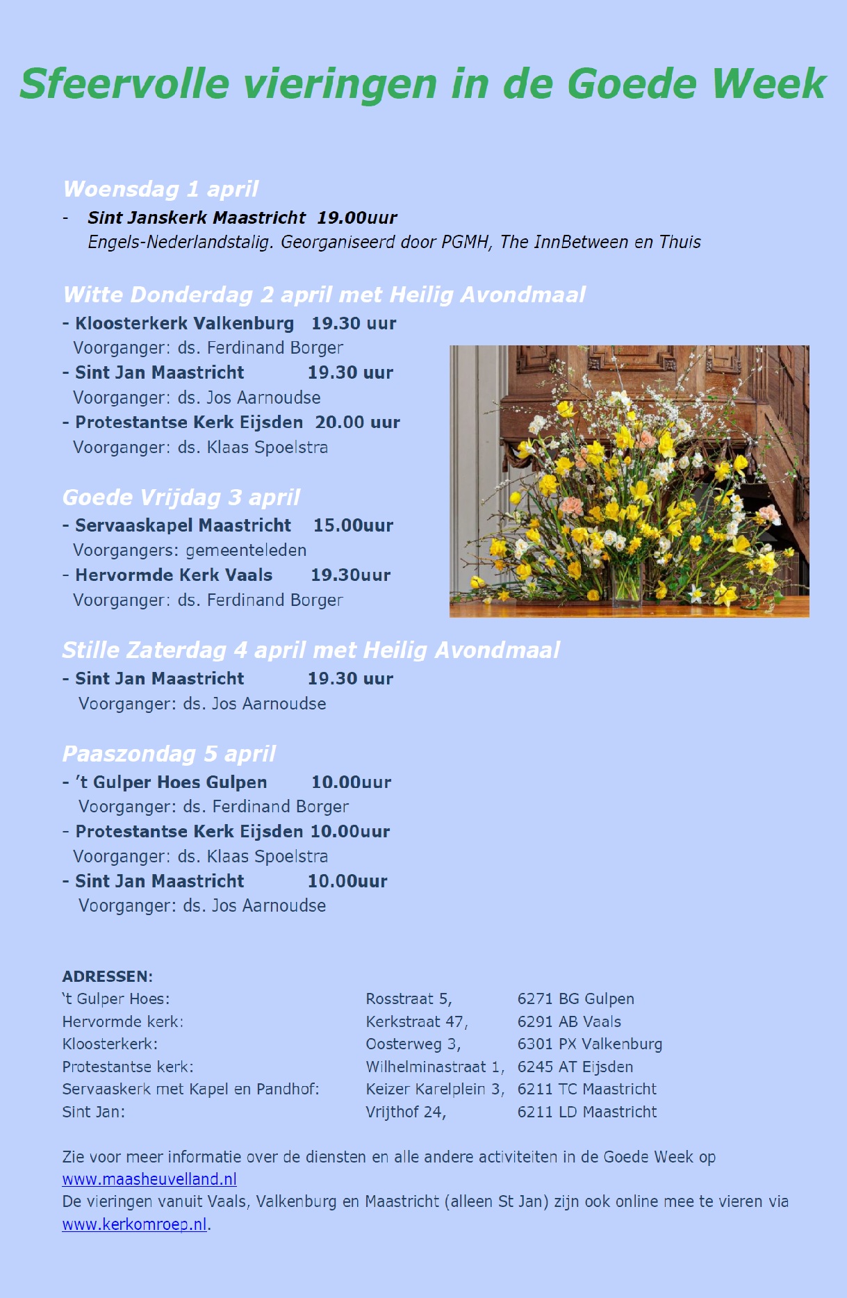 Vespers en maaltijden in de 40-dagen tijd: Hoop verzamelen. Dagen en locaties: - 24 februari Kloosterkerk Valkenburg, - 3 maart Trefpunt St. Jan Maastricht, - 10 maart Kloosterkerk Valkenburg. - 17 maart Trefpunt St. Jan Maastricht, - 24 maart Oude Pastorie Vaals, - 31 maart Trefpunt St. Jan. Tijden: Inloop: 18.00uur Maaltijd: 18.30uur Vesper: 19.30uur Aanmelden: predikant@maasheuvelland.nl Het gegeven, het licht dat niet dooft, wordt de kern van onze vespers in de weken naar Pasen toe. Hoop verzamelen op wat voor manier dan ook. In een foto, beeld, verhaal gebed of gedicht. We verzamelen wat ons gaande houdt op weg naar het feest van de Opstanding. Hoop verzamelen tegen alle wanhoop in. Soms valt het je ten deel. ![]() Vervoer nodig? Graag even bij opgave doorgeven, dan wordt dat geregeld. Welkom! Ds. Ferdinand Borger | ||